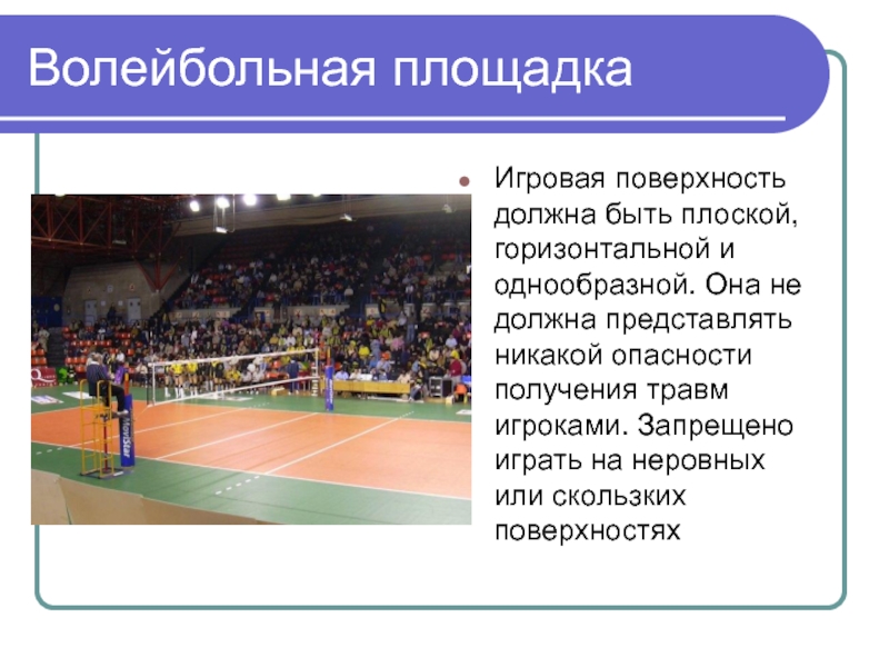 должна представлять никакой опасности получения травм игроками. Запрещено играть на неровных или скользких поверхностях