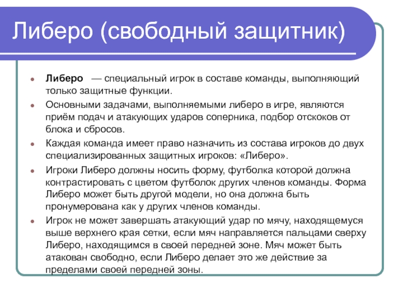 Либеро — специальный игрок в составе команды, выполняющий только защитные