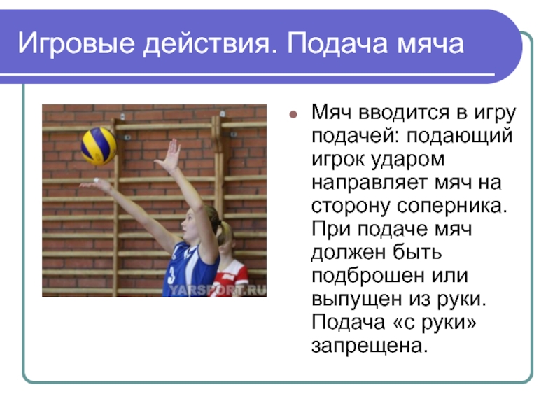 направляет мяч на сторону соперника. При подаче мяч должен быть подброшен или выпущен из руки. Подача «с руки» запрещена.