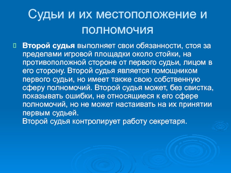 за пределами игровой площадки около стойки, на противоположной стороне от первого судьи, лицом в его сторону. Второй судья является помощником первого судьи, но имеет также свою собственную сферу полномочий. Второй судья может, без свистка, показывать ошибки, не относящиеся к его сфере полномочий, но не может настаивать на их принятии первым судьей.