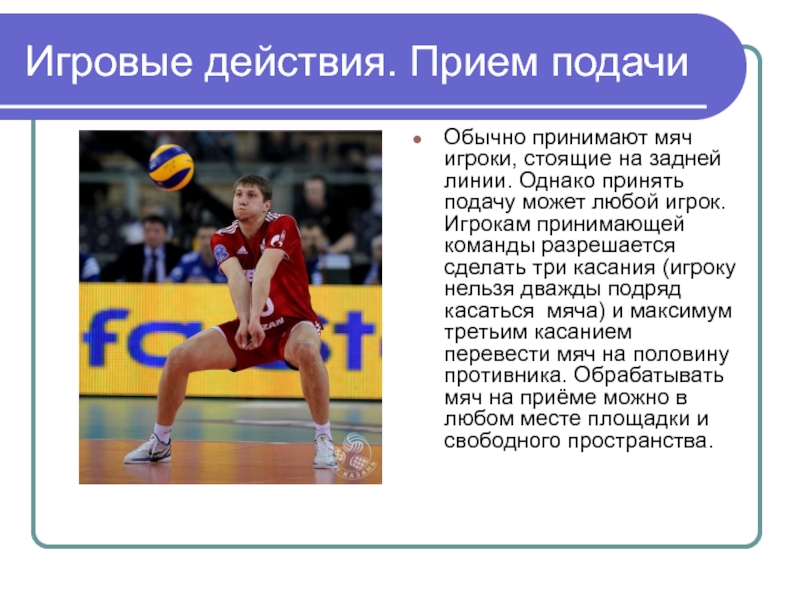 Однако принять подачу может любой игрок. Игрокам принимающей команды разрешается сделать три касания (игроку нельзя дважды подряд касаться мяча) и максимум третьим касанием перевести мяч на половину противника. Обрабатывать мяч на приёме можно в любом месте площадки и свободного пространства.