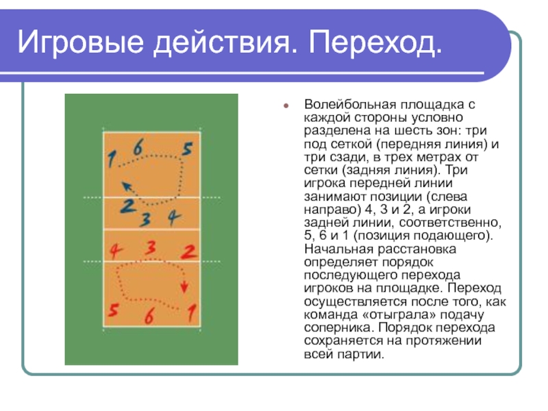 зон: три под сеткой (передняя линия) и три сзади, в трех метрах от сетки (задняя линия). Три игрока передней линии занимают позиции (слева направо) 4, 3 и 2, а игроки задней линии, соответственно, 5, 6 и 1 (позиция подающего). Начальная расстановка определяет порядок последующего перехода игроков на площадке. Переход осуществляется после того, как команда «отыграла» подачу соперника. Порядок перехода сохраняется на протяжении всей партии.