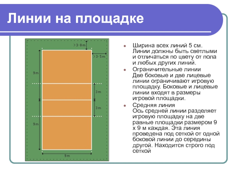 Две боковые и две лицевые линии ограничивают игровую площадку. Боковые и лицевые линии входят в размеры игровой площадки.