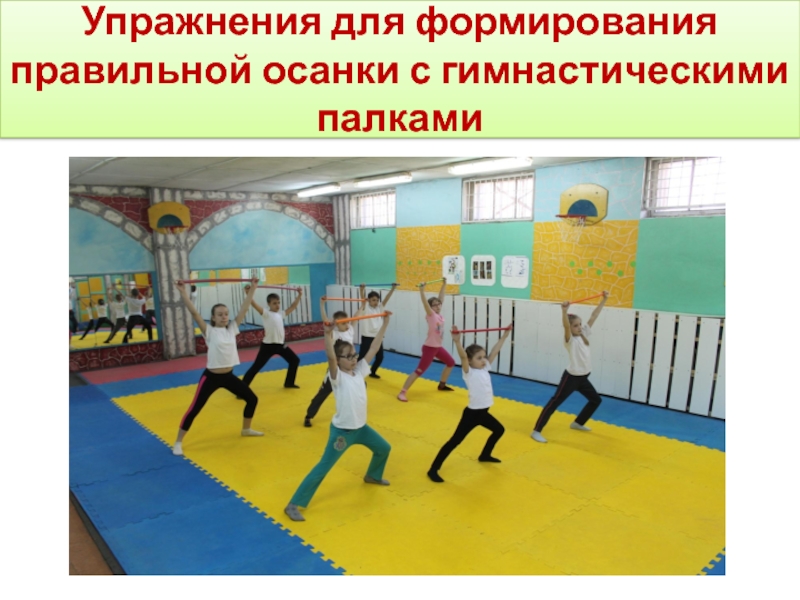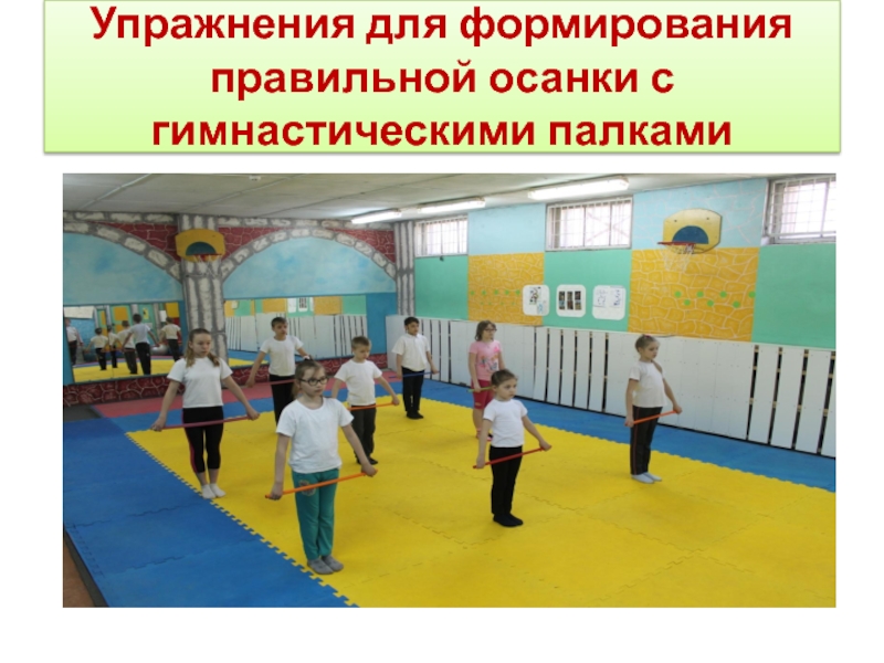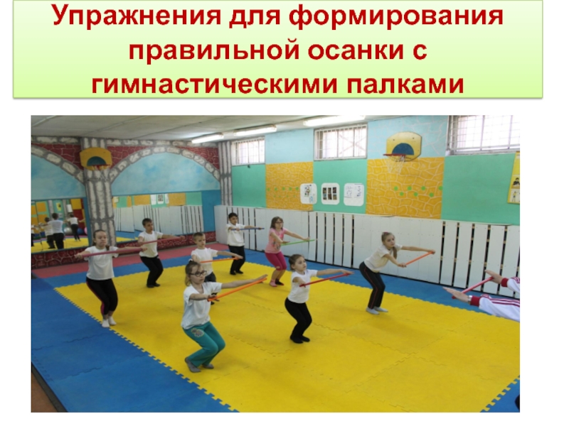 Слайд 50Упражнения для формирования правильной осанки с гимнастическими палками