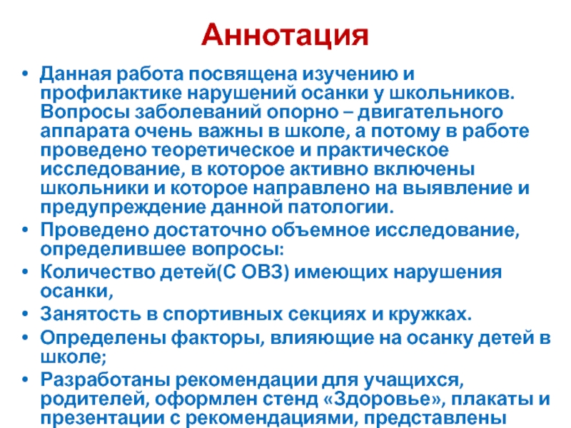 заболеваний опорно – двигательного аппарата очень важны в школе, а потому в работе проведено теоретическое и практическое исследование, в которое активно включены школьники и которое направлено на выявление и предупреждение данной патологии.