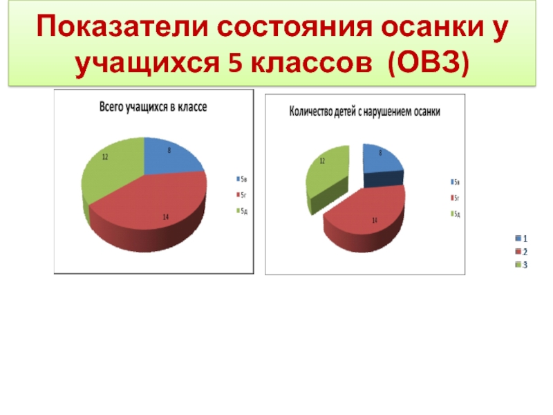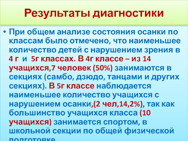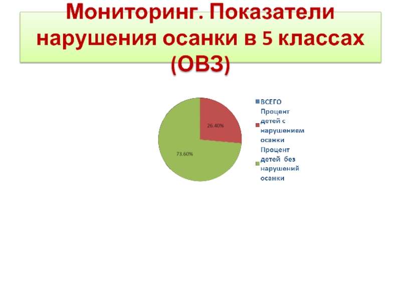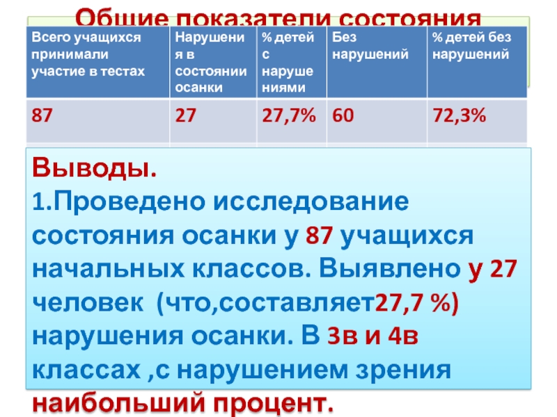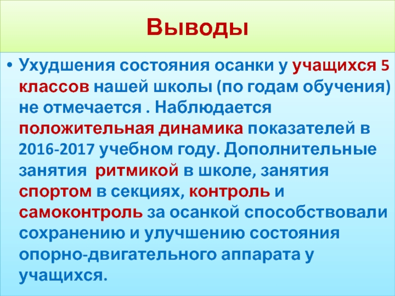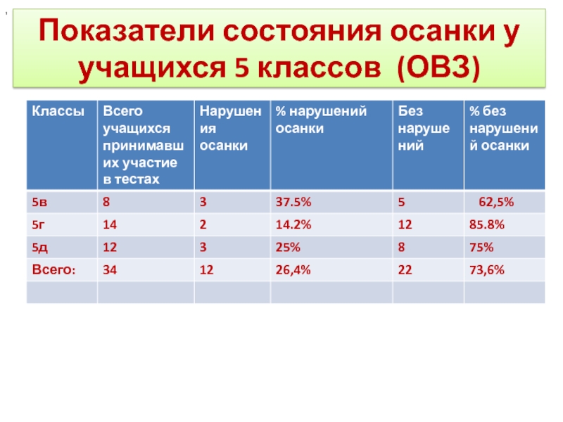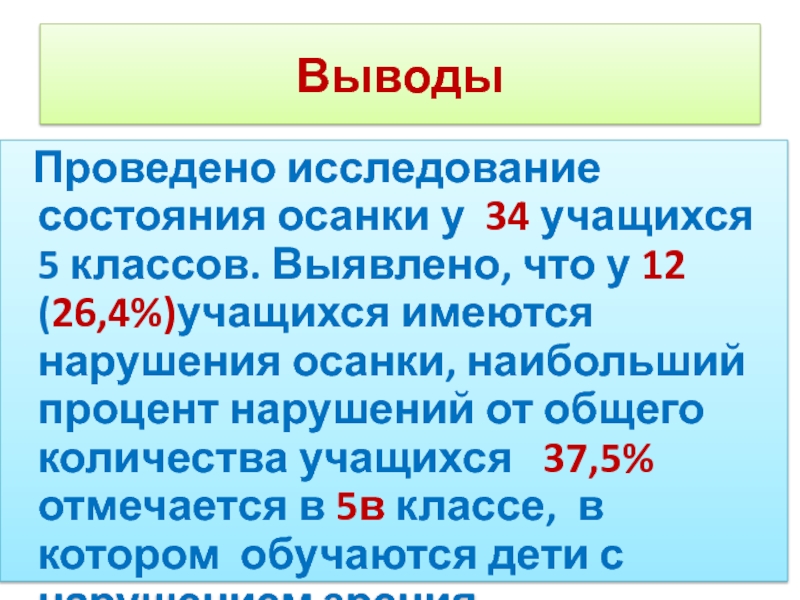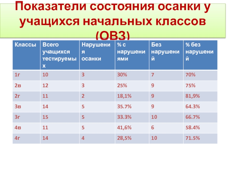 Анализируя результаты исследований осанки 1-4 , 5 классов(ОВЗ),сделали вывод что % детей с нарушением осанки ( 39 чел., 32 %)ниже чем, по статистике по России (от 50% и выше)и большого увеличения количества детей с патологией ОД в школе не наблюдается.