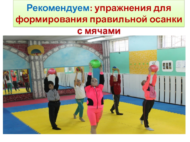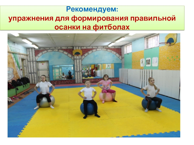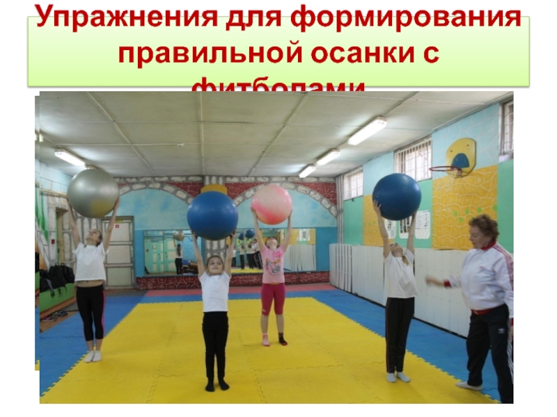 Слайд 56Упражнения для формирования правильной осанки с фитболами