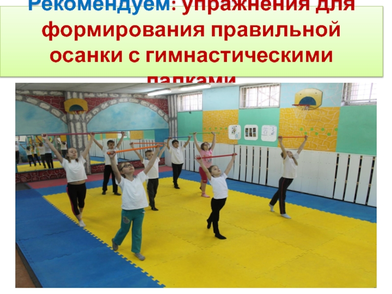 Слайд 49Рекомендуем: упражнения для формирования правильной осанки с гимнастическими палками
