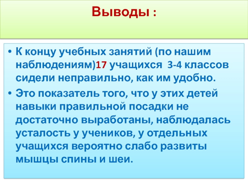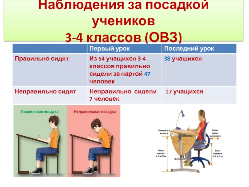 Это показатель того, что у этих детей навыки правильной посадки не достаточно выработаны, наблюдалась усталость у учеников, у отдельных учащихся вероятно слабо развиты мышцы спины и шеи.