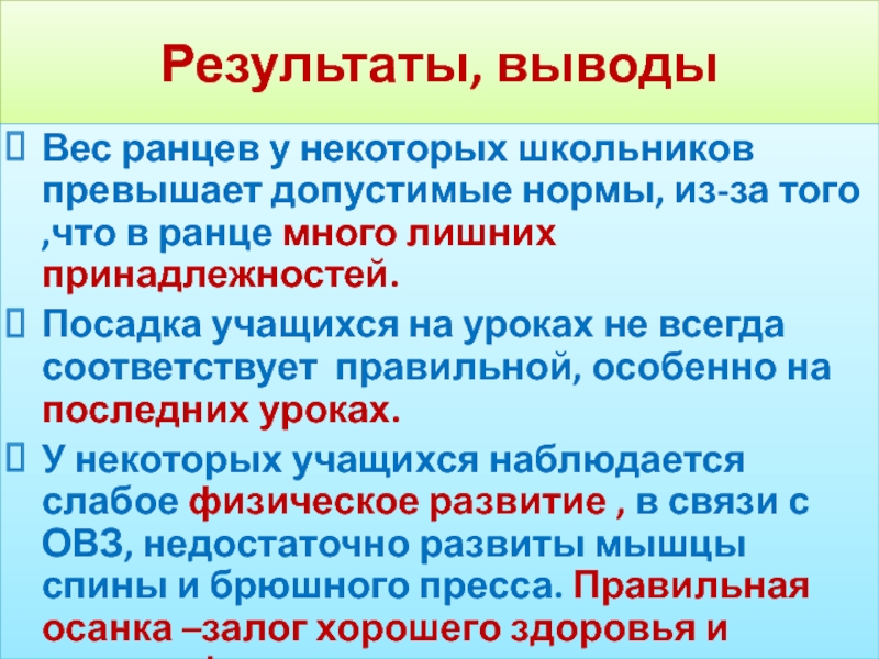 У некоторых учащихся наблюдается слабое физическое развитие , в связи с ОВЗ, недостаточно развиты мышцы спины и брюшного пресса. Правильная осанка –залог хорошего здоровья и красоты!