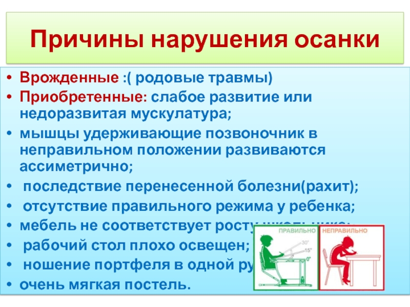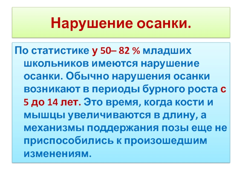 осанки. Обычно нарушения осанки возникают в периоды бурного роста с 5 до 14 лет. Это время, когда кости и мышцы увеличиваются в длину, а механизмы поддержания позы еще не приспособились к произошедшим изменениям.