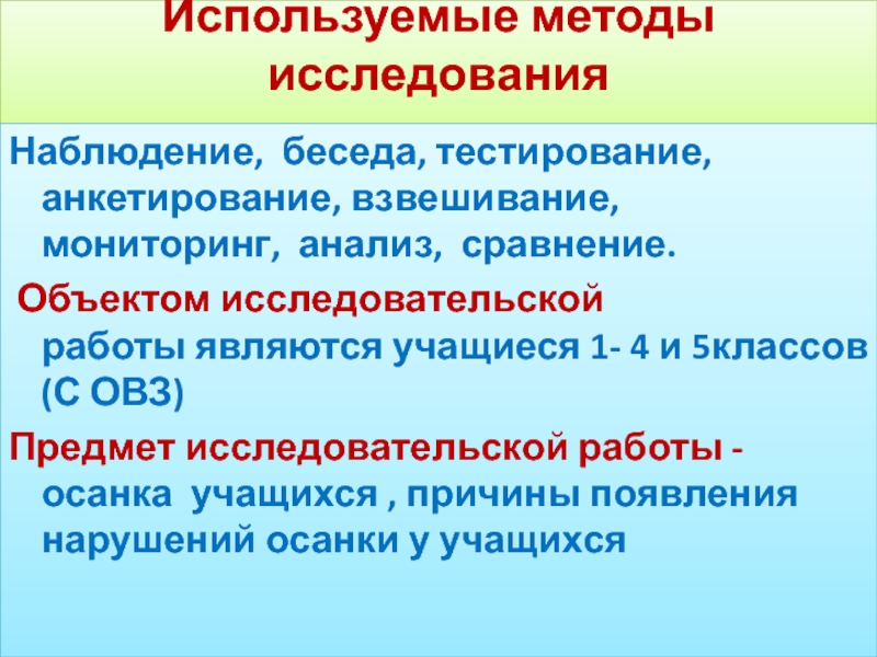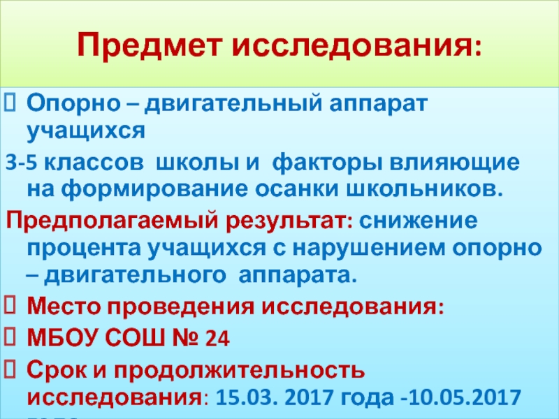 Предмет исследовательской работы - осанка учащихся , причины появления нарушений осанки у учащихся