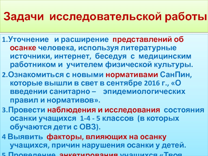 3.Провести наблюдения и исследования состояния осанки учащихся 1-4 - 5 классов (в которых обучаются дети с ОВЗ).