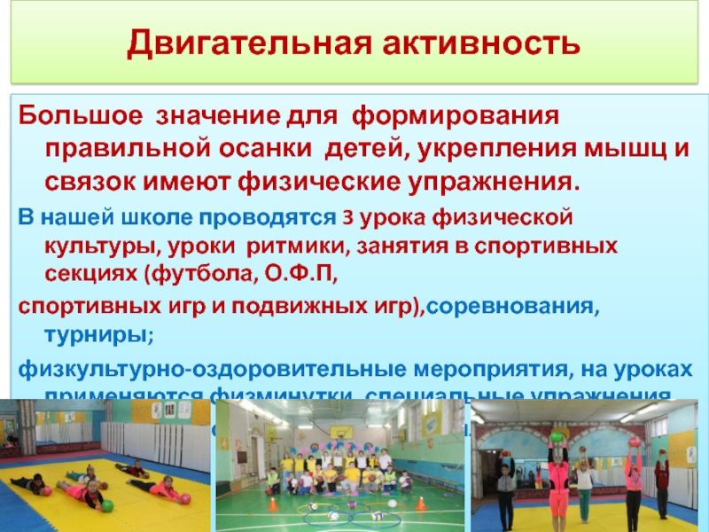 В нашей школе проводятся 3 урока физической культуры, уроки ритмики, занятия в спортивных секциях (футбола, О.Ф.П,