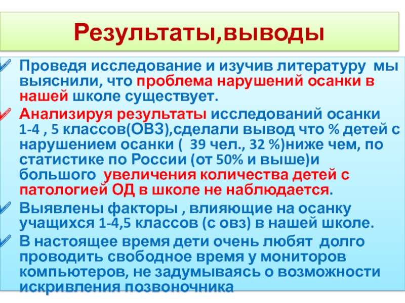 Выявлены факторы , влияющие на осанку учащихся 1-4,5 классов (с овз) в нашей школе.