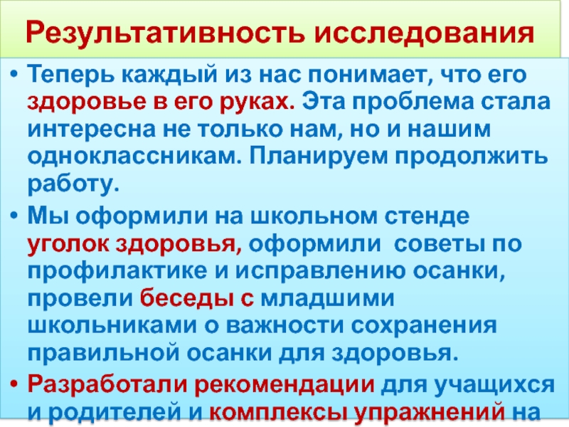 Мы оформили на школьном стенде уголок здоровья, оформили советы по профилактике и исправлению осанки, провели беседы с младшими школьниками о важности сохранения правильной осанки для здоровья.