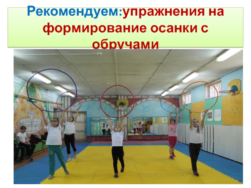 Слайд 52Рекомендуем:упражнения на формирование осанки с обручами
