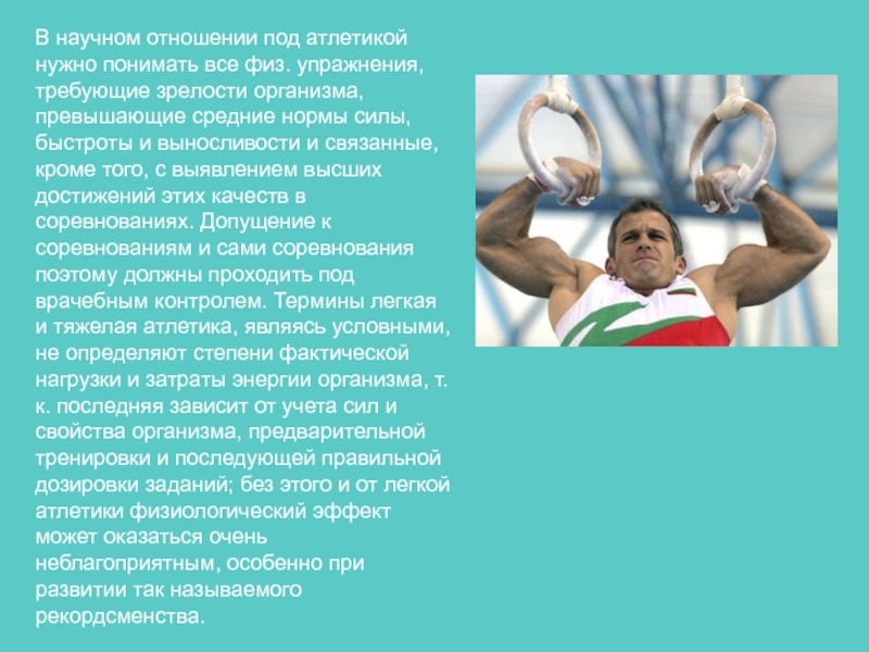 зрелости организма, превышающие средние нормы силы, быстроты и выносливости и связанные, кроме того, с выявлением высших достижений этих качеств в соревнованиях. Допущение к соревнованиям и сами соревнования поэтому должны проходить под врачебным контролем. Термины легкая и тяжелая атлетика, являясь условными, не определяют степени фактической нагрузки и затраты энергии организма, т. к. последняя зависит от учета сил и свойства организма, предварительной тренировки и последующей правильной дозировки заданий; без этого и от легкой атлетики физиологический эффект может оказаться очень неблагоприятным, особенно при развитии так называемого рекордсменства.