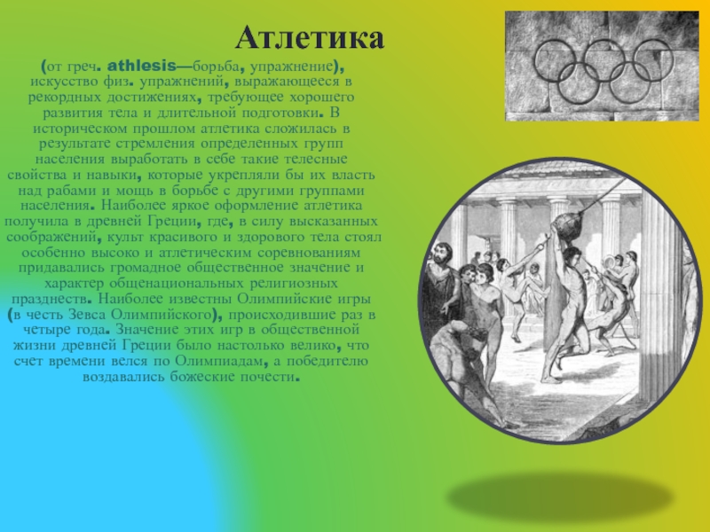 достижениях, требующее хорошего развития тела и длительной подготовки. В историческом прошлом атлетика сложилась в результате стремления определенных групп населения выработать в себе такие телесные свойства и навыки, которые укрепляли бы их власть над рабами и мощь в борьбе с другими группами населения. Наиболее яркое оформление атлетика получила в древней Греции, где, в силу высказанных соображений, культ красивого и здорового тела стоял особенно высоко и атлетическим соревнованиям придавались громадное общественное значение и характер общенациональных религиозных празднеств. Наиболее известны Олимпийские игры (в честь Зевса Олимпийского), происходившие раз в четыре года. Значение этих игр в общественной жизни древней Греции было настолько велико, что счет времени велся по Олимпиадам, а победителю воздавались божеские почести.