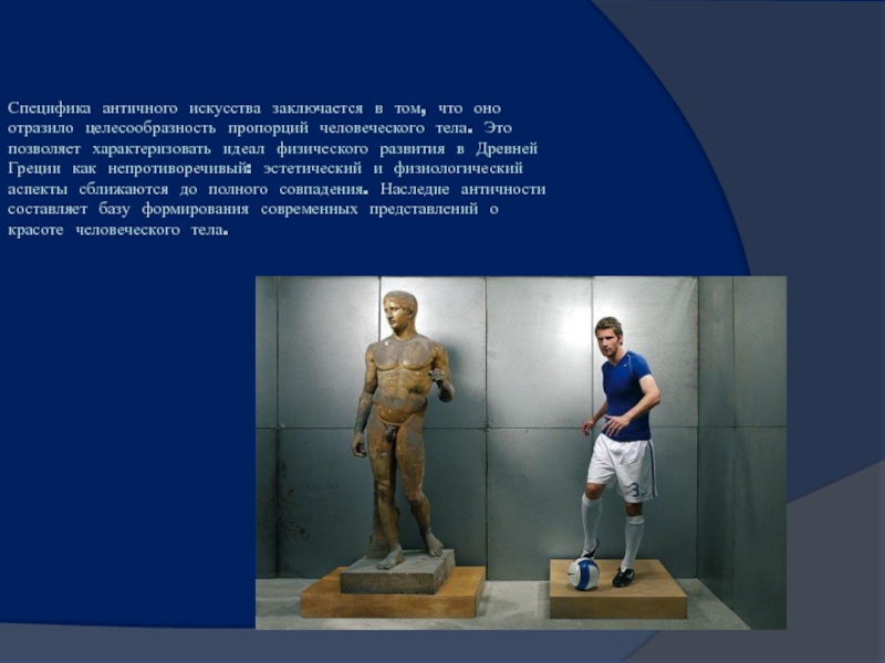 человеческого тела. Это позволяет характеризовать идеал физического развития в Древней Греции как непротиворечивый: эстетический и физиологический аспекты сближаются до полного совпадения. Наследие античности составляет базу формирования современных представлений о красоте человеческого тела.
