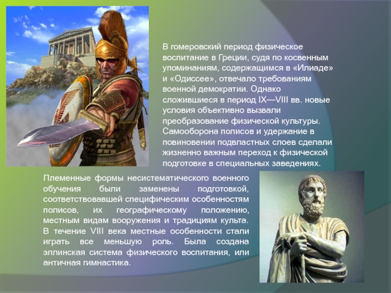 содержащимся в «Илиаде» и «Одиссее», отвечало требованиям военной демократии. Однако сложившиеся в период IX—VIII вв. новые условия объективно вызвали преобразование физической культуры. Самооборона полисов и удержание в повиновении подвластных слоев сделали жизненно важным переход к физической подготовке в специальных заведениях.