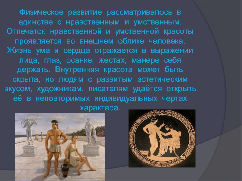 Слайд 8Физическое развитие рассматривалось в единстве с нравственным и умственным. Отпечаток нравственной
