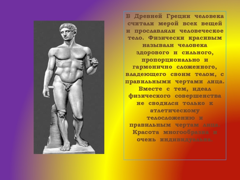 тело. Физически красивым называли человека здорового и сильного, пропорционально и гармонично сложенного, владеющего своим телом, с правильными чертами лица. Вместе с тем, идеал физического совершенства не сводился только к атлетическому телосложению и правильным чертам лица. Красота многообразна и очень индивидуальна.