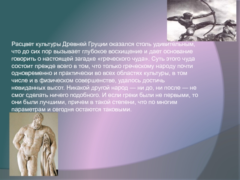 вызывает глубокое восхищение и дает основание говорить о настоящей загадке «греческого чуда». Суть этого чуда состоит прежде всего в том, что только греческому народу почти одновременно и практически во всех областях культуры, в том числе и в физическом совершенстве, удалось достичь невиданных высот. Никакой другой народ — ни до, ни после — не смог сделать ничего подобного. И если греки были не первыми, то они были лучшими, причем в такой степени, что по многим параметрам и сегодня остаются таковыми.