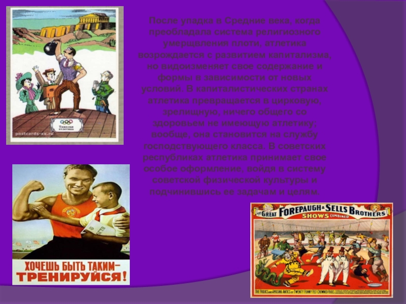 атлетика возрождается с развитием капитализма, но видоизменяет свое содержание и формы в зависимости от новых условий. В капиталистических странах атлетика превращается в цирковую, зрелищную, ничего общего со здоровьем не имеющую атлетику; вообще, она становится на службу господствующего класса. В советских республиках атлетика принимает свое особое оформление, войдя в систему советской физической культуры и подчинившись ее задачам и целям.