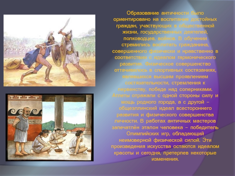 жизни, государственных деятелей, полководцев, войнов. В обучении стремились воспитать гражданина, совершенного физически и нравственно в соответствии с идеалом гармонического развития. Физическое совершенство оттачивалось в спортивных состязаниях, являвшихся высшим проявлением состязательности, стремления к первенству, победе над соперниками.