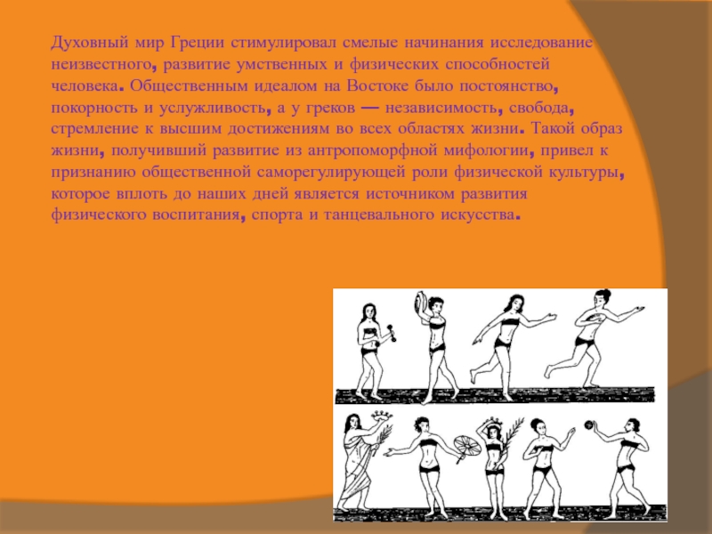 физических способностей человека. Общественным идеалом на Востоке было постоянство, покорность и услужливость, а у греков — независимость, свобода, стремление к высшим достижениям во всех областях жизни. Такой образ жизни, получивший развитие из антропоморфной мифологии, привел к признанию общественной саморегулирующей роли физической культуры, которое вплоть до наших дней является источником развития физического воспитания, спорта и танцевального искусства.