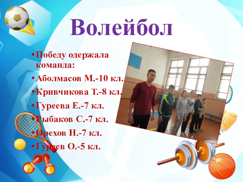 ВолейболПобеду одержала команда:Аболмасов М.-10 кл.Кривчикова Т.-8 кл.Гуреева Е.-7 кл.Рыбаков С.-7 кл.Орехов Н.-7 кл.Гуреев О.-5 кл.