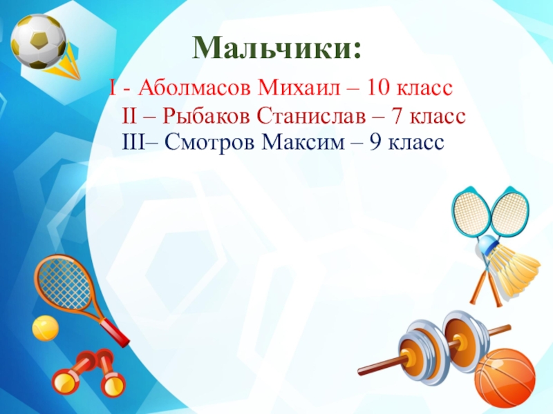I - Аболмасов Михаил – 10 класс II – Рыбаков Станислав – 7 класс III– Смотров Максим – 9 класс