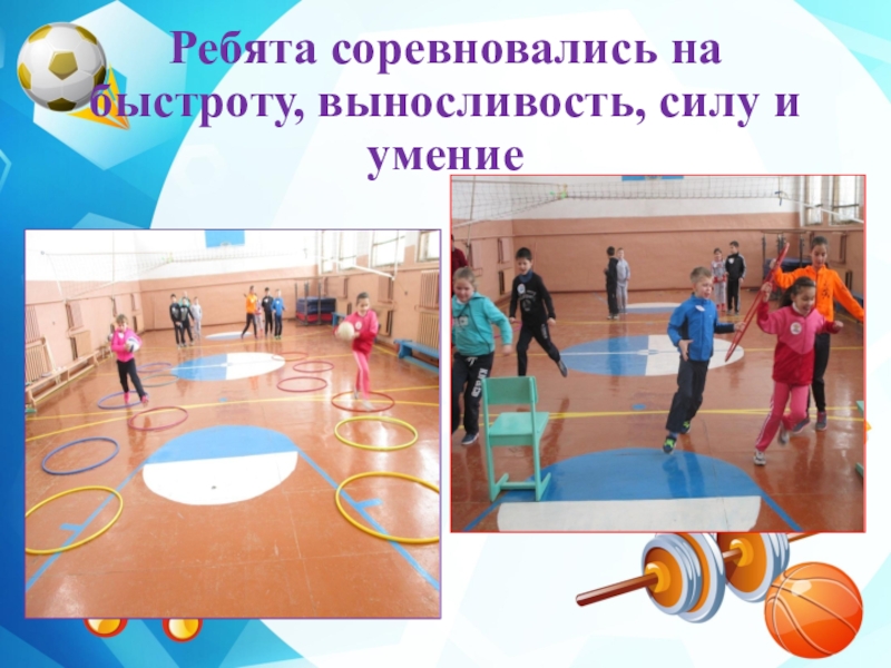 Слайд 4Ребята соревновались на быстроту, выносливость, силу и умение