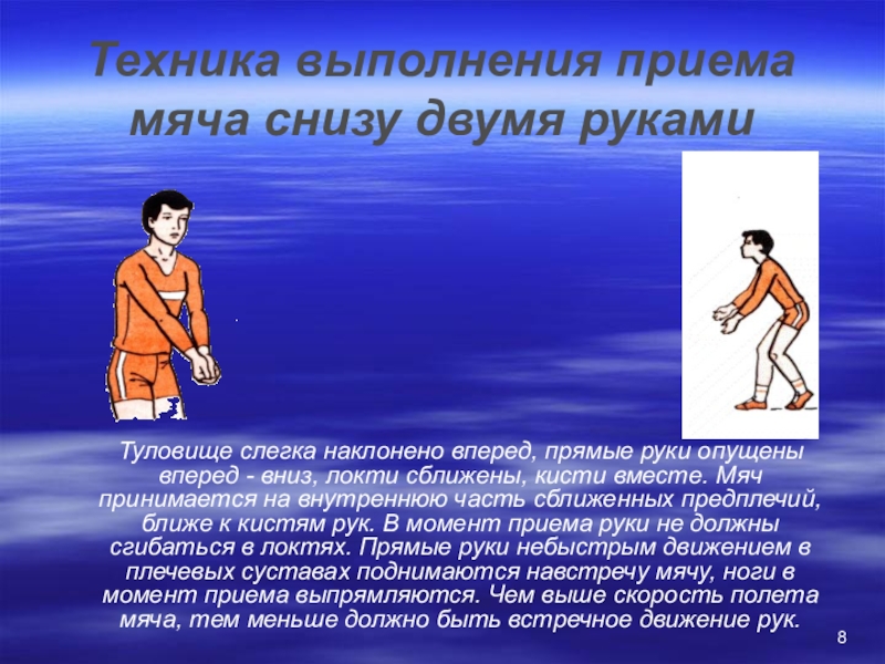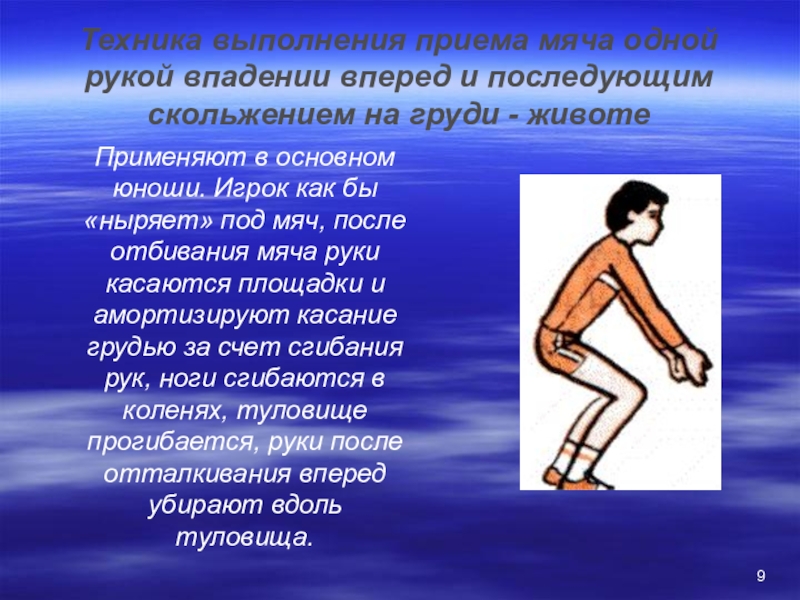 Применяют в основном юноши. Игрок как бы «ныряет» под мяч, после отбивания мяча руки касаются площадки и амортизируют касание грудью за счет сгибания рук, ноги сгибаются в коленях, туловище прогибается, руки после отталкивания вперед убирают вдоль туловища.