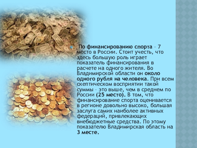что здесь большую роль играет показатель финансирования в расчете на одного жителя. Во Владимирской области он около одного рубля на человека. При всем скептическом восприятии такой суммы – это выше, чем в среднем по России (25 место). В том, что финансирование спорта оценивается в регионе довольно высоко, большая заслуга самих наиболее активных федераций, привлекающих внебюджетные средства. По этому показателю Владимирская область на 3 месте.