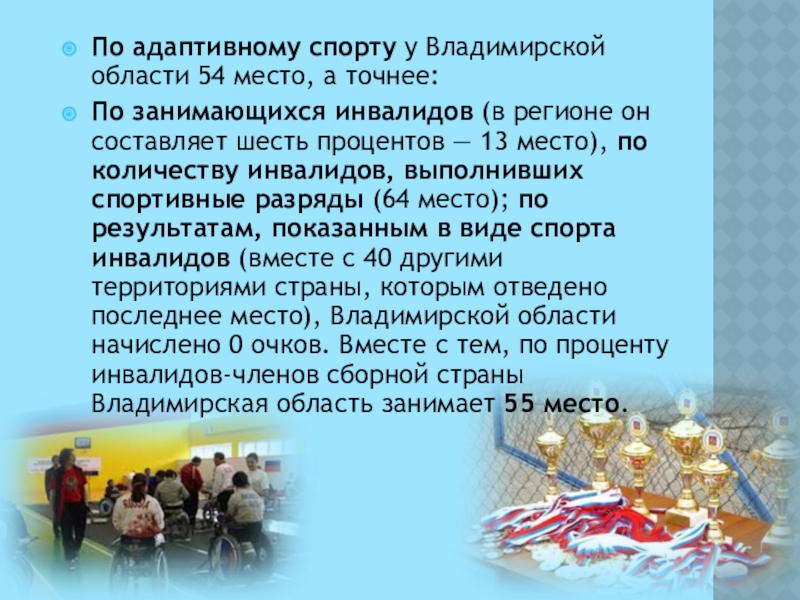 инвалидов (в регионе он составляет шесть процентов — 13 место), по количеству инвалидов, выполнивших спортивные разряды (64 место); по результатам, показанным в виде спорта инвалидов (вместе с 40 другими территориями страны, которым отведено последнее место), Владимирской области начислено 0 очков. Вместе с тем, по проценту инвалидов-членов сборной страны Владимирская область занимает 55 место.