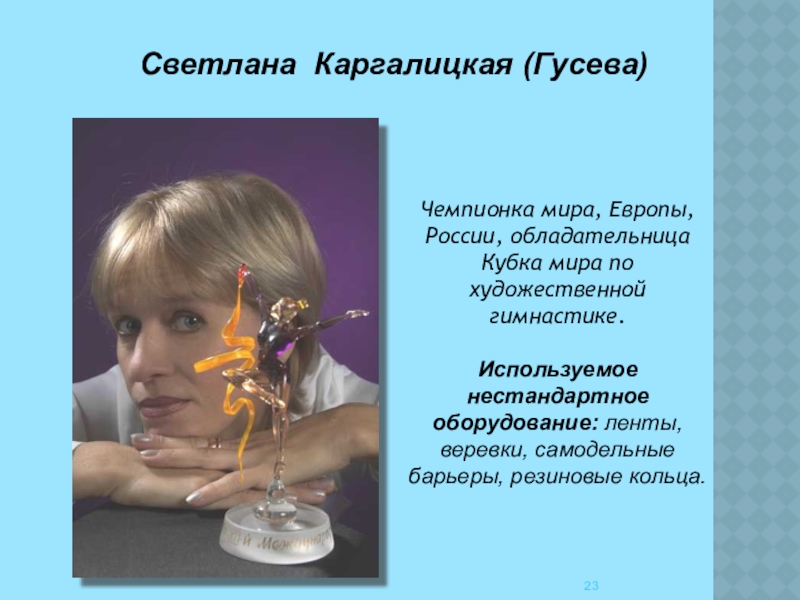 Чемпионка мира, Европы, России, обладательница Кубка мира по художественной гимнастике.
