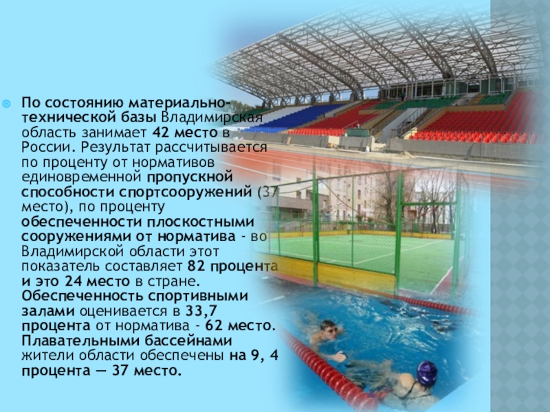 Результат рассчитывается по проценту от нормативов единовременной пропускной способности спортсооружений (37 место), по проценту обеспеченности плоскостными сооружениями от норматива - во Владимирской области этот показатель составляет 82 процента и это 24 место в стране. Обеспеченность спортивными залами оценивается в 33,7 процента от норматива - 62 место. Плавательными бассейнами жители области обеспечены на 9, 4 процента — 37 место.