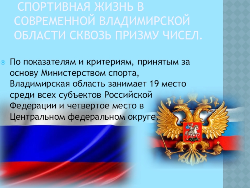 и критериям, принятым за основу Министерством спорта, Владимирская область занимает 19 место среди всех субъектов Российской Федерации и четвертое место в Центральном федеральном округе.