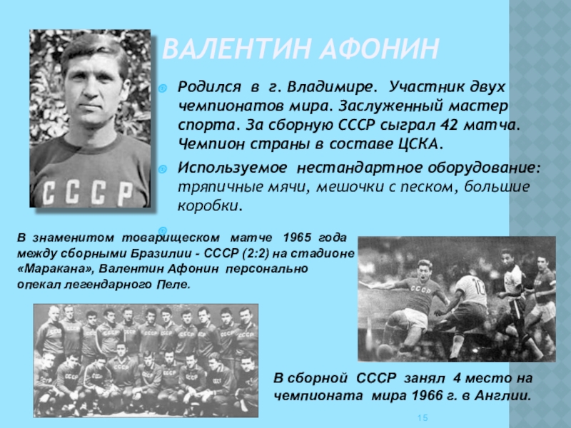 В знаменитом товарищеском матче 1965 года между сборными Бразилии - СССР (2:2) на стадионе «Маракана», Валентин Афонин персонально