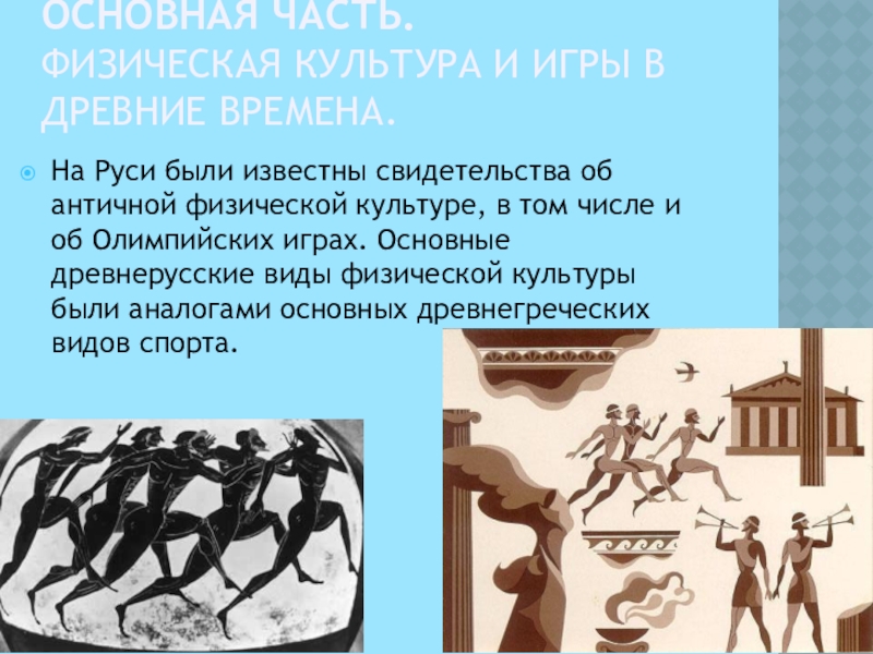 свидетельства об античной физической культуре, в том числе и об Олимпийских играх. Основные древнерусские виды физической культуры были аналогами основных древнегреческих видов спорта.