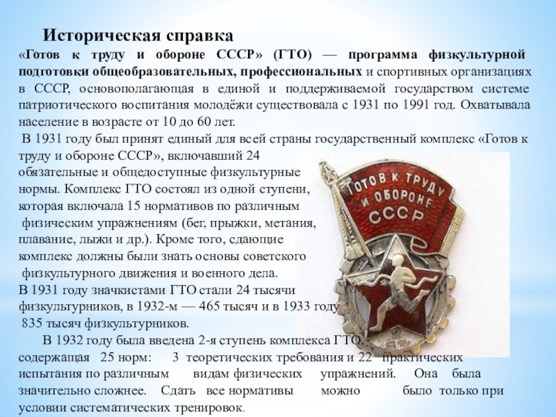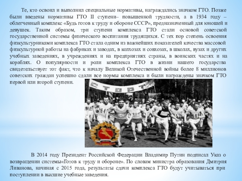 награждались значком ГТО. Позже были введены нормативы ГТО II ступени– повышенной трудности, а в 1934 году – облегченный комплекс «Будь готов к труду и обороне СССР», предназначенный для юношей и девушек. Таким образом, три ступени комплекса ГТО стали основой советской государственной системы физического воспитания трудящихся. С тех пор степень освоения физкультурниками комплекса ГТО стала одним из важнейших показателей качества массовой физкультурной работы на фабриках и заводах, в колхозах и совхозах, в школах, вузах и других учебных заведениях, в учреждениях и на предприятиях страны, в воинских частях и на кораблях. О популярности и роли комплекса ГТО в жизни нашего государства свидетельствует тот факт, что к началу Великой Отечественной войны более 8 миллионов советских граждан успешно сдали все нормы комплекса и были награждены значком ГТО первой или второй ступени.