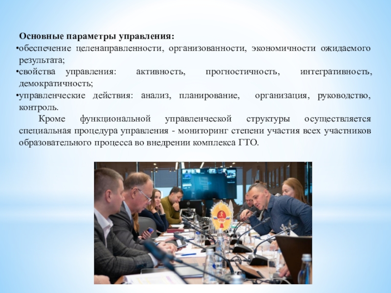 Кроме функциональной управленческой структуры осуществляется специальная процедура управления - мониторинг степени участия всех участников образовательного процесса во внедрении комплекса ГТО.