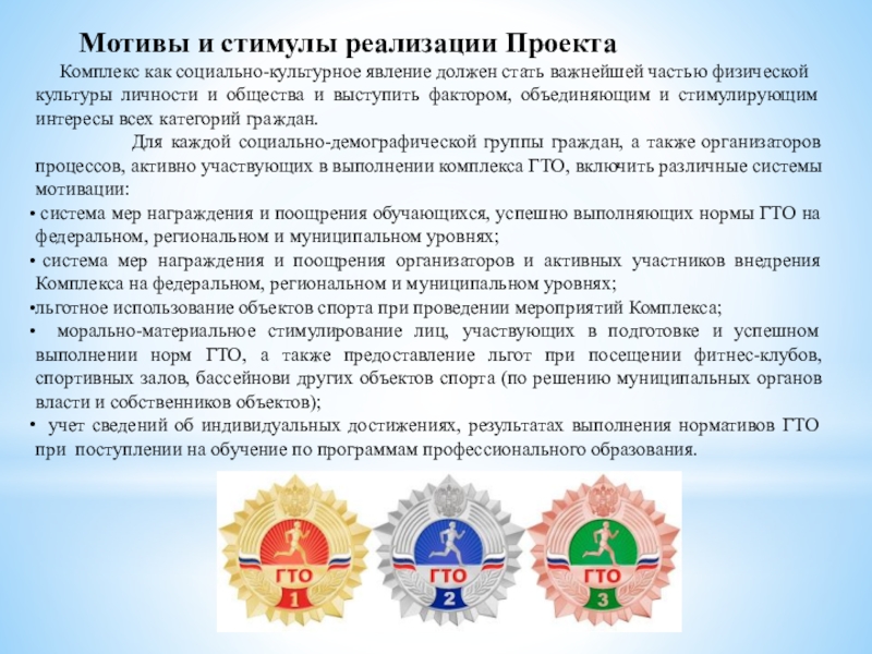 Для каждой социально-демографической группы граждан, а также организаторов процессов, активно участвующих в выполнении комплекса ГТО, включить различные системы мотивации: