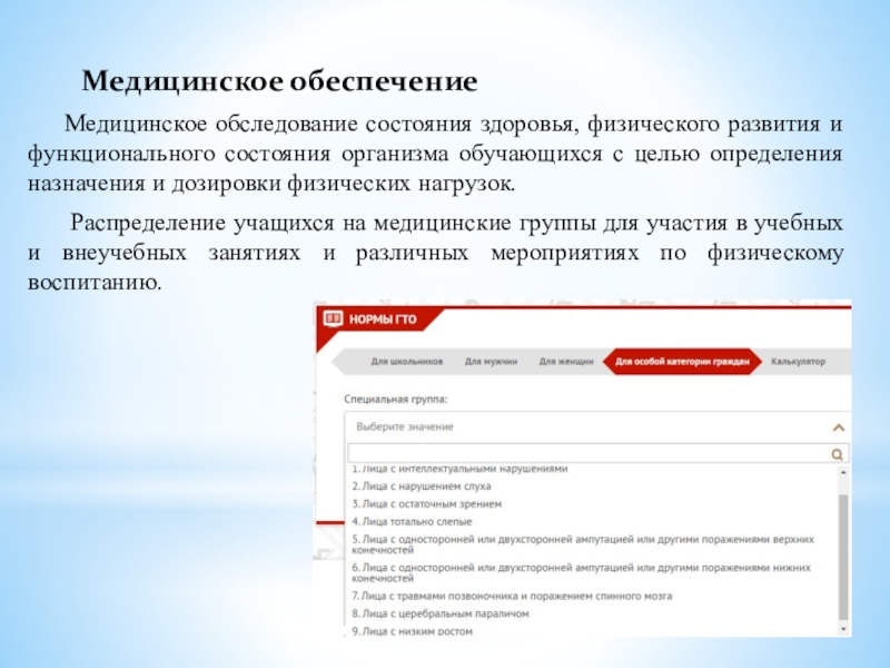Медицинское обследование состояния здоровья, физического развития и функционального состояния организма обучающихся с целью определения назначения и дозировки физических нагрузок.