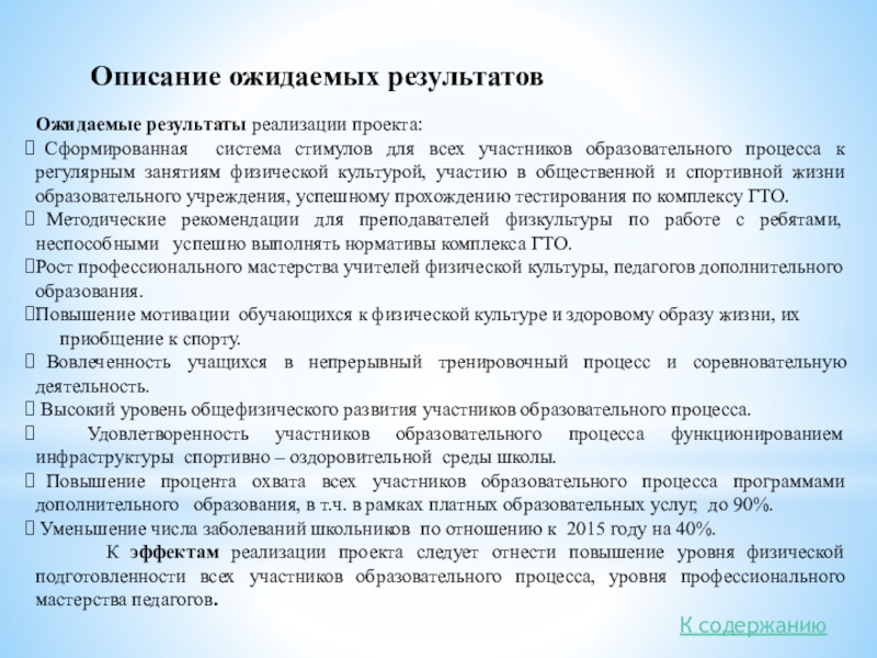 К эффектам реализации проекта следует отнести повышение уровня физической подготовленности всех участников образовательного процесса, уровня профессионального мастерства педагогов.