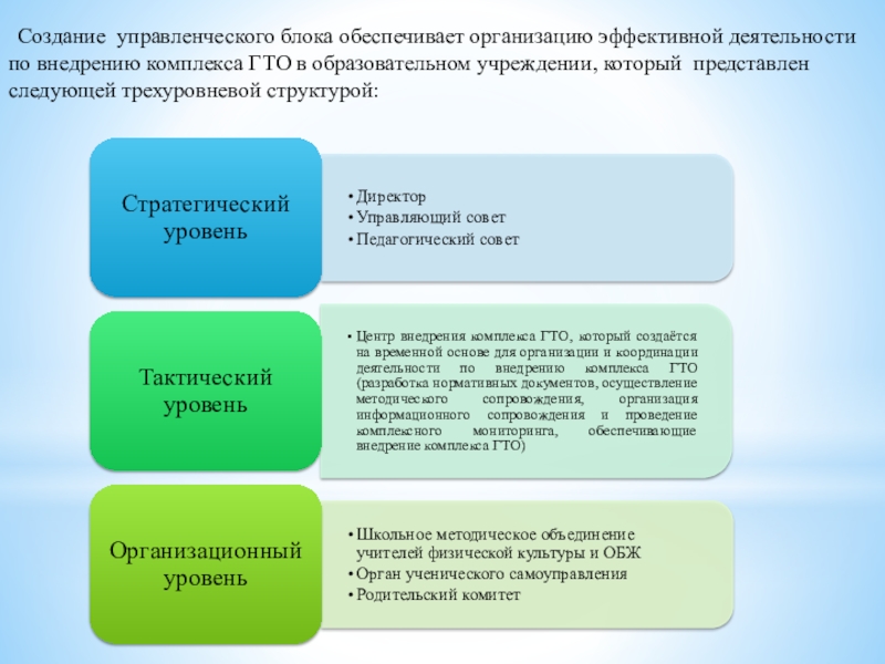 комплекса ГТО в образовательном учреждении, который представлен следующей трехуровневой структурой: