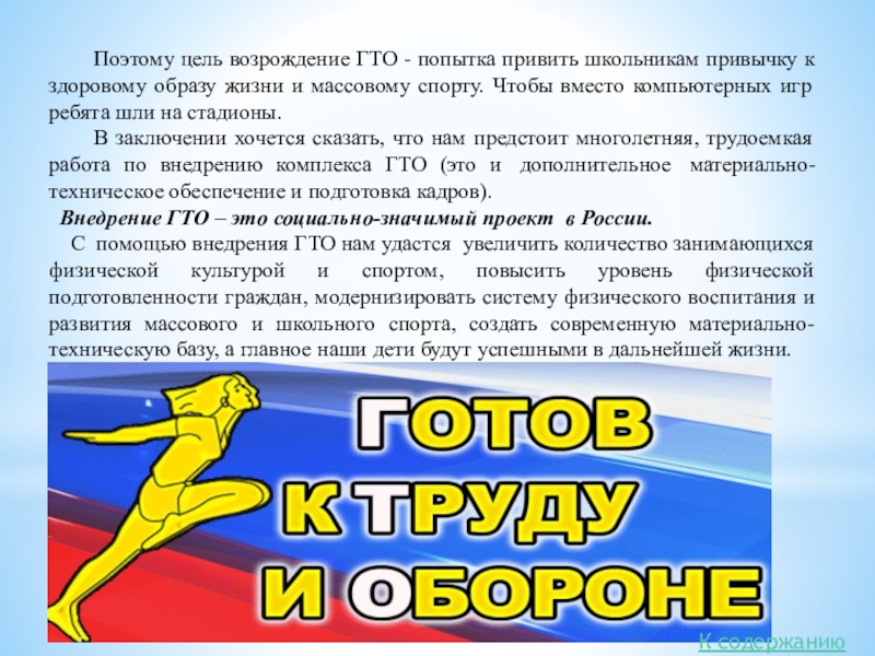 Слайд 19 Поэтому цель возрождение ГТО - попытка привить