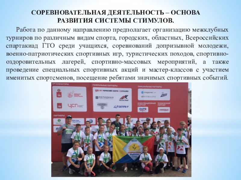 данному направлению предполагает организацию межклубных турниров по различным видам спорта, городских, областных, Всероссийских спартакиад ГТО среди учащихся, соревнований допризывной молодежи, военно-патриотических спортивных игр, туристических походов, спортивно-оздоровительных лагерей, спортивно-массовых мероприятий, а также проведение специальных спортивных акций и мастер-классов с участием именитых спортсменов, посещение ребятами значимых спортивных событий.